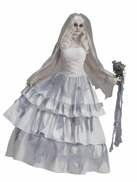 Creep people out this Halloween with the Haunted Bride Costume for Women. This one of a kind piece is perfect for all those pranksters out there who want to give people a scare. It also works perfect for a horror themed play, Halloween party, or another special occasion to give people goosebumps. People won?t be able to figure you out ? as you?ll be a beautiful bride walking down the street, yet scary with the unique dress on. Put on your best freaky make up and people might even question if you?re an actual haunted bride who came back to scare the living! You will look absolutely drop dead gorgeous, in a different way than those picture-perfect brides. Walk straight out of the cemetery and into your friends or family?s homes to give them a living nightmare with this fashionable haunted bride costume! It will remind everyone just how fun and silly you can be!