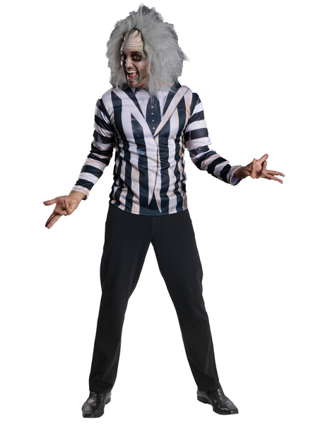 Beetlejuice is brought to life in the black and white striped suit of the Beetlejuice Deluxe Adult Costume. This fun and eye-catching ensemble has everything you need to begin your transformation as the iconic character from the '80s. This bold look features a long-sleeved dress jacket with vertical stripes down the front and horizontal ones on the arms. A single black button sits at the center of the design for a closed look. For a complete look, a dickie with an attached tie is also included. A pair of matching pants with vertical stripes is also included. Complete the look with our Beetlejuice Mask or Ghost Stories Tm Makeup Kit, both sold separately. Wig and shoes are not included. See our online Size Chart to determine your best fit.
