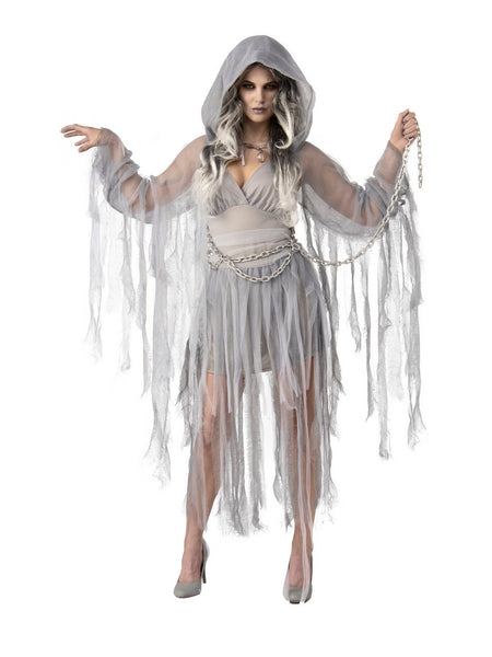 Save the sheet with cutouts for the kids and step up your costume game this year with the Women's Ghostly Beauty Costume L. As a white/grey ghost, you can be sure that you'll haunt everyone's memories forever. This is a classic costume that you can wear over and over again - a ghost costume sure to haunt you.