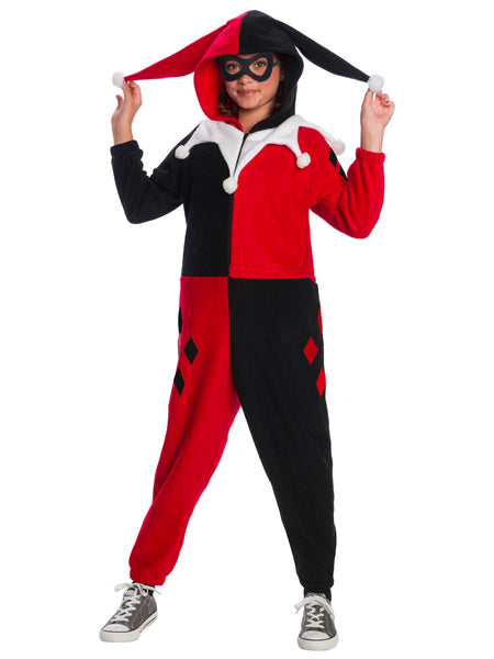 A perfect blend of style, comfort, and mischief, your child is going to just love dressing up in the Girls' DC Super Hero Harley Quinn Zipsters Costume this year. With this set, you will receive just the Harley Quinn get-up you need to transform your daughter into the Joker's main partner in crime. Featuring a red and black hooded jumpsuit with an attached jester hat headpiece and white collar, as well as a matching black eye mask, she is going to love this fun cozy attire.