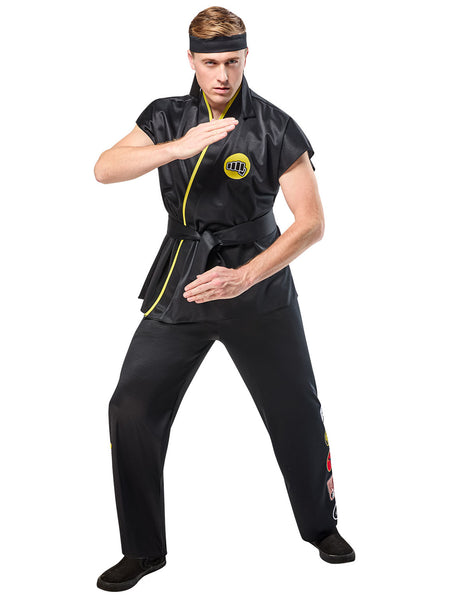 Step into the dojo and embrace your Cobra Kai spirit with the officially licensed Men's Karate Kid Classic Cobra Kai Johnny Lawrence Costume! This costume is perfect for fans of the Karate Kid series and the hit show Cobra Kai, bringing to life the classic look of Johnny Lawrence, the iconic karate champion. Featuring a black and yellow top, black pants, black belt, and black headband, capturing all the details of Johnny's legendary style. Whether you're gearing up for Halloween, a themed party, or a cosplay event, this costume will make sure you stand out as the ultimate Cobra Kai sensei. Order now and get ready to show no mercy with the ultimate cobra kai look.