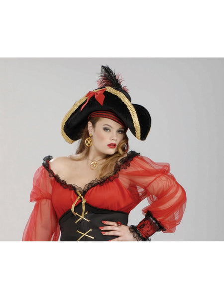When you go out to find your treasure on Halloween, youre going to need a hat to let your crew know youre the captain this year! Youre going to make Jack Sparrow himself envy your style when you put on this Lady Buccaneer Adult Hat, since its a Pirates of the Caribbean worthy piece of costuming that will give you the vibes of a swashbuckling adventurer. When you show up to Tortuga wearing this youre sure to turn some heads!