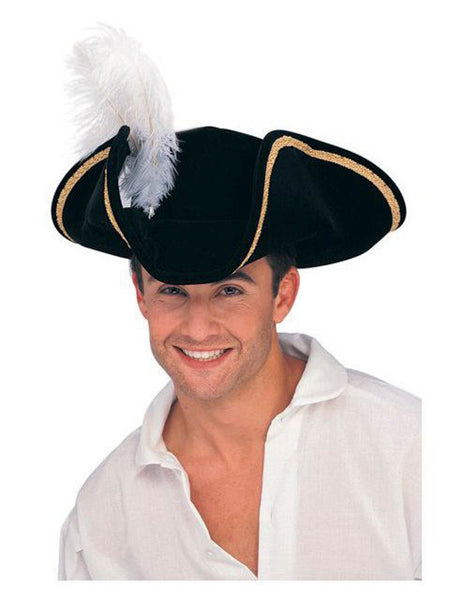 You'll have a swashbuckling good time this Halloween when you wear the Black Buccaneer Tricorn Hat Adult! The black hat has an upturned rim with golden trim. White plumage sticks out from the top of the hat. This is a great addition to any pirate costume.