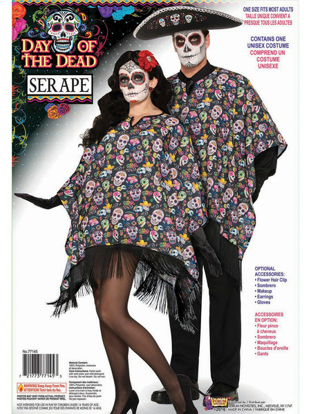 If you need to stay toasty come Halloween make sure you do so in a manner that preserves the theme of your costume. With the Day of the Dead Serape Accessory youll be sporting a poncho style garment decorated with colorful skulls and a black lace trim that will act as a perfect flourish for nearly any siesta look that you might be prepping for the big day. This is your chance to sport a new look that will make for a welcome dose of vibrant color.