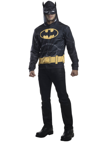 You don't have to dress up in a bulky one-piece jumpsuit from head to toe in order to get a super look this Halloween! The Men's Batman Adult Hoodie will give you the look of Gotham's favorite vigilante while you stay comfortable and content all night long. The garment is black with a printed yellow belt along the bottom as well as Batman's classic logo in yellow and black across the chest. Make sure to keep your identity a secret from your friends by wearing the hood, which is attached to the sweatshirt and covers the top half of your face with a design that emulates Bruce Wayne's classic headpiece. Whether you're going to a party or trick-or-treating with your little ones this Halloween, you'll be cozy all night long in this ensemble. This item can also be included in your everyday wardrobe to add some excitement to your ordinary clothing.