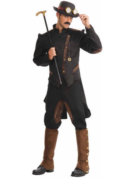 All aboard the coolest coach whose destination is a fantastical world where the Industrial Age meets the wild West known as steampunk. This trend has been around for a little while, but it's gaining popularity with the speed of a locomotive and you can take advantage whether you're going to a costume party or a comic convention you'll look awesome in this Men's Steampunk Gentleman Costume. To properly be on trend with this style you'll need a pair of black slacks with brown velvet accents and patches that matches the trim and accents also seen on the included tailcoat that's cut asymmetrically, has a high collar, brass buttons and medallion chain piece, and long coattails . Spruce up the look with your own derby hat or spats and enjoy this hot trend wearing our Men's Steampunk Gentleman Costume.