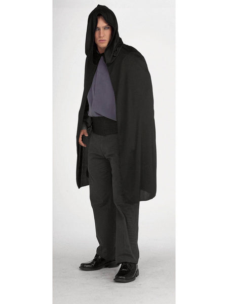 Everyone needs a cape in their wardrobe and this Hooded Velvet Black Cape Adult Costume is a perfect additional to your closet. The one-size-fits most black cape features an attached black hood. This is an excellent choice for someone who wants a simple costume as well as others who would like something more complex. For the easy costume, throw this cape over anything you own and you are an instant villain. This is great for someone who just wants to wear a little something while giving out candy or if you have to travel to get to a party and don't want to wear a cumbersome outfit while in transit. Add a black dress and cauldron and be a witch, an apple and be the wicked stepmother from Snow White, or a scythe and be the grim reaper. Other suggestions include Lord Voldemort, a Ringwraith, or the Black Cloaks from Dr. Who.