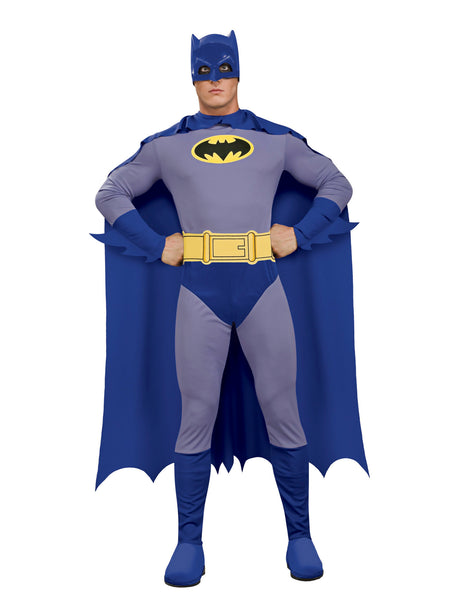 Holy outfit, Batman! This Men's Deluxe Muscle Chest Batman Costume will transform you into a colorful caped crusader. Officially licensed, it includes a blue muscle chest jumpsuit, boot tops, headpiece and cape and a yellow belt. Highlighted on the jumpsuit is a large yellow and black Batman logo. The boot tops are attached to the pants legs. The headpiece is a cowl, covering the head and the upper part of the face. This is not the black outfit worn by the Dark Knight, it is a styled like the costume worn by Adam West as Bruce Wayne/Batman in the 1960's TV series. Not only can you wear this to a Halloween party, it is also a playful outfit to don at a 60's themed event.