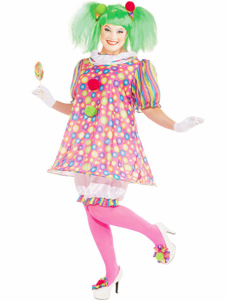 Are you looking for a Halloween outfit that will tickle your fancy? Then you must order the Women's Plus Size Tickles the Clown, which includes a dress, matching bloomers, shoe covers and fabric covered hair tie. Designed to fit most women sized 18-22, the colorful dress features dual patterns; it has vertical stripes on the sleeves and polka dots on the rest of the dress, with the dominant color being pink. The white bloomers are trimmed with completing stripes while the vibrant shoe covers and scrunches are each highlighted by a pompom. This playful outfit is very kid friendly and can be worn at a child's birthday party. It is also an amusing choice for a carnival or circus themed event. Gloves, tights, lollipop and wig do not come with the outfit.