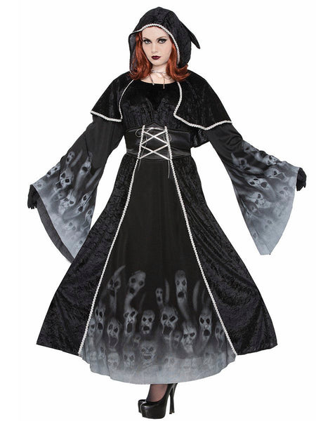 This versatile Adult Deluxe Hooded Dress Plus Size Costume is a must have addition to your costume wardrobe. The full-length black robe lined in red and features a front panel of red highlighted with black satin crisscross lacing. The outfit also features long sleeves that flare out past the elbows. What will you be when you put on this garb? Wear it alone and you can be a mysterious maiden. If you want to transform into a sultry vampiress, just order some fangs and fake blood from us. Or order a sword and be a warrior maiden. Purchase a crystal ball or a staff so that you can be a sorceress. A cauldron would be a great accessory for a witch. Other accessories to consider are jewelry, makeup and footwear.
