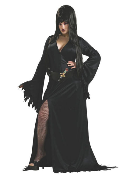Become the true Mistress of the Dark this year when you put on our Women's Plus Size Elvira Mistress of the Dark Costume. Walk into the party sporting this gorgeous and elegant look, and you bet there will be bats flying as you make your grand entrance. With this set, you will receive a stunning black dress with jagged decorative edges, a matching black belt, and a ceremonial dagger (wig not included). Wearing this dark sorceress look, you'll feel more powerful than ever.