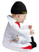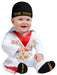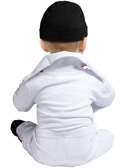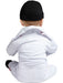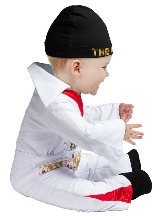 Not even one and already asking for blue suede shoes. Put your tiny heartthrob in a Newborn Elvis Jumper Costume and he'll be the most popular guy there! Each package starts with a long-sleeved jumper. Its bright white body is decorated with colorful patches, filling the body with red, blue, and gold wings! The red shirt and standing collar sewn into the top will help you stand out on stage. You don't want to start a controversy--pull on the included white pants to cover him up! The black booties are inscribed with the words Elvis Lives. Keep cozy by popping on the black cap and let all your friends know that you're The King! People say that Elvis is gone, but do you think a legend could die that easy? Bring back the spirit of the 50s when you get this Newborn Elvis Onesie Costume for your future musician! Show up wearing your own Elvis costume (sold here) for a cute theme.