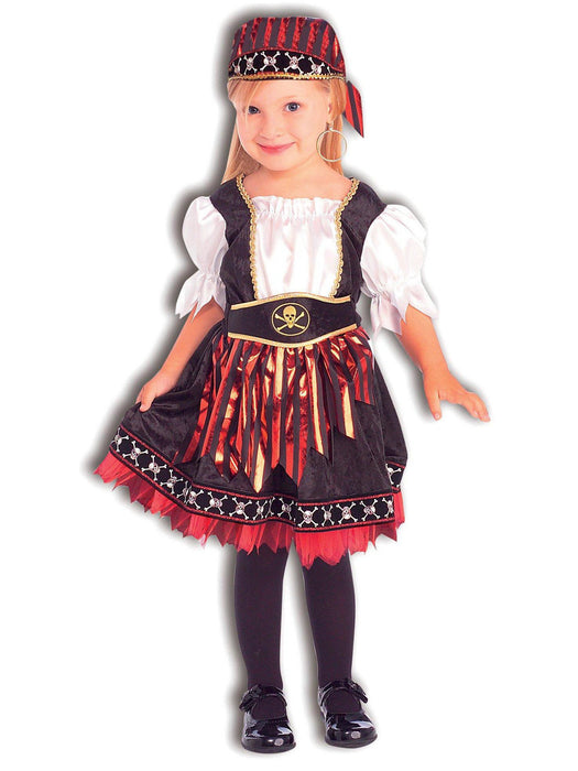 • Dress your little one as a reaving pillager out for candy and other sweets! In the Lil' Pirate Cutie Toddler / Child Costume your kid won't have to intimidate anyone on the open seas - people will gladly handover their loot! The dress has white puffed sleeves and a belt with a golden skull and crossbones. The headpiece is adorned with a golden trim and in red and black color. Order yours today!