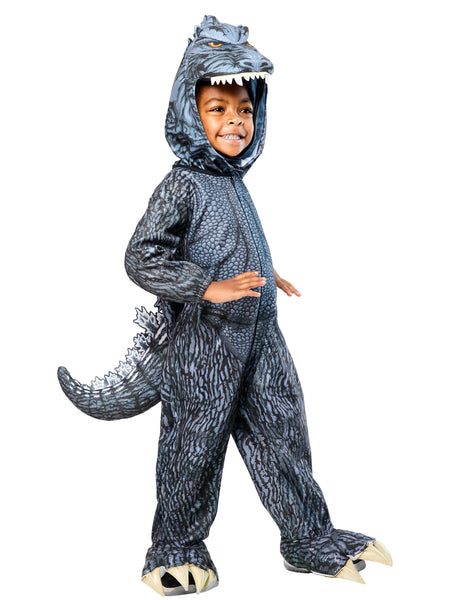 Transform your little one into a legendary monster with the Godzilla Classic Costume for Babies and Toddlers—an officially licensed outfit perfect for Halloween, costume parties, or playful dress-up. This adorable and cozy costume features a zip-front jumpsuit in gray and black scale print, complete with attached claw feet for authentic monster fun. The hooded headpiece showcases Godzilla’s sharp-toothed grin and menacing yellow eyes, while a detachable tail with exposed scales completes the iconic look. Comfortable, easy to wear, and irresistibly cute, it’s the ultimate way for toddlers to stomp into adventure as the King of the Monsters.