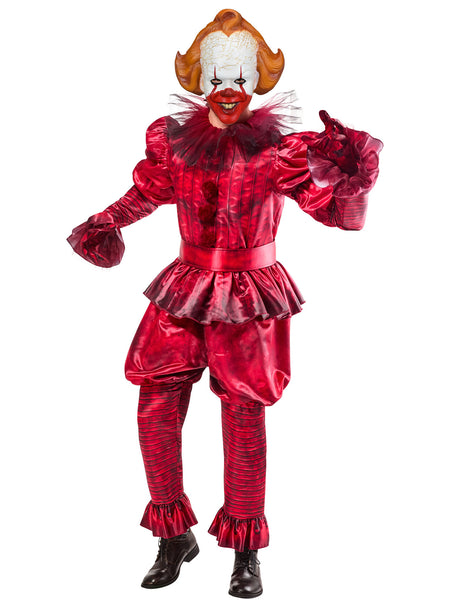 Dare to face your fears with the officially licensed Men's IT: Welcome to Derry Pennywise Costume - Deluxe! Inspired by the terrifying Pennywise from the IT movie, this deluxe costume will bring your horror dreams to life. This movie-accurate costume includes a blood-red buttoned jumpsuit, a ruffled collar, and all the menacing details you expect from the terrifying clown, including a half mask with ghostly white face and the signature red makeup. The fabric is durable yet comfortable, ensuring it holds up over time, even during the scariest of events. Perfect for Halloween, cosplay, or horror-themed events, this deluxe outfit brings the fear and fascination of It right to you. Order now and step into the dark world of It as Pennywise.