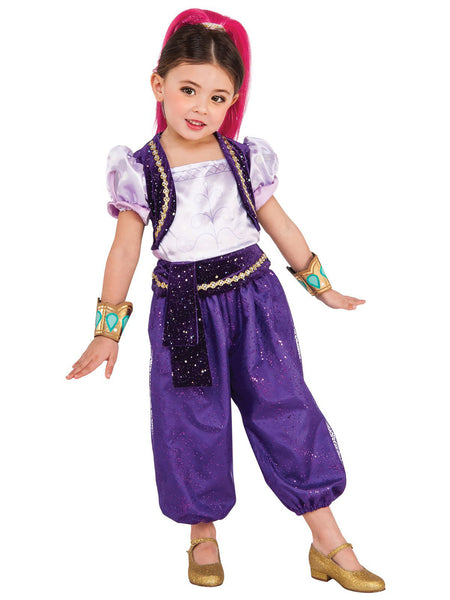 Let your little girl dress up as one half of the genie twin duo Shimmer and Shine in this Shimmer and Shine Toddler Deluxe Shimmer Costume. Full of heart, Shimmer is completely optimistic and full of energy. She loves everything that she's doing at all times and is always looking for some more fun that she could be having. Now your little bundle of energy can dress up as her favorite genie twin in in this costume, which comes complete with a jumpsuit featuring bright purple sparkling pants and a light purple top with puffed sleeves. An attached purple vest trimmed with gold completes that look. Also included is a pink hair headpiece and a pair of yellow and turquoise bracelets. An ideal half of a costume for twins this will be your daughter's wish come true!