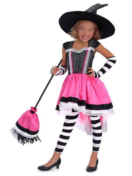 Enchant your friends and family with your daughter's Halloween costume this year. Our Luna the Witch Girl's Costume can help. It's a mash up of different textures and styles so appealing anyone who lays eyes on her will be impressed for sure. The dress starts at the top as a lacey patterned black and white affair before flaring into a pink skirt with black and white trim. The hat is pointed and expertly crooked at the top. The whole ensemble, however, is brought together by the hand and leg warmers. Sure, they are just simple, thick striped, black and white pieces but sometimes less is more. And this Luna the Witch Girl's Costume is more than enough to prove that.