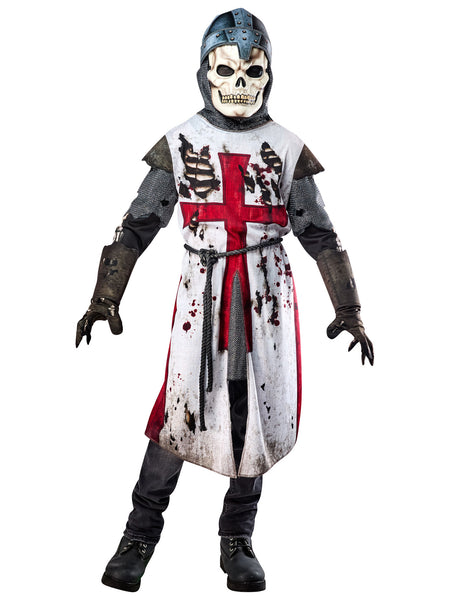 Strike fear into the battlefield with the Boys’ Skeleton Knight Crusader Costume with Mask, a bold and chilling look perfect for Halloween or themed parties. This detailed costume features a tunic with blood splatter, a red cross, exposed skeletal ribs, and chain-like armor for a terrifyingly heroic appearance. The set includes a foam helmet, chain-like hood, half skeleton mask, gray rope belt, and tattered gray gloves to complete the fearsome knight look. Comfortable and ready to wear, this skeleton crusader costume lets young warriors bring dark medieval fantasy to life with a perfect blend of spooky and heroic style.
