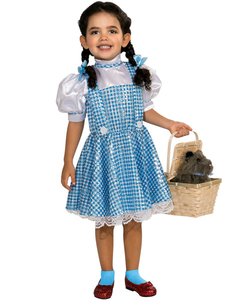 Your daughter will be ready to see the wonderful Wizard of Oz when she wears this Dorothy sequin costume on Halloween! Follow the Yellow Brick Road while trick or treating and make some new friends along the way. This Girls' Sparkling Wizard of Oz Dorothy Costume includes Dorothy's blue and white dress decorated with hundreds of sequins for a fun sparkling effect! It also includes matching blue hair bows just like the ones Dorothy wears. Make sure you check our accessories section for all sorts of great additions like a basket with Toto or a pair of ruby slippers. If you have a dog, your daughter is sure to love bringing him or her along with a matching Dorothy dog costume! If not, get some of her friends to dress up as the Scarecrow, the Tin Man, and the Cowardly Lion so they can set off to see the Wizard together!