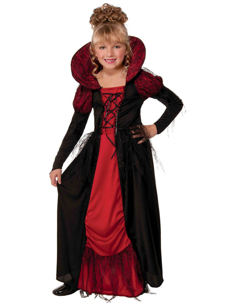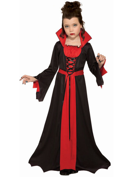 Turn your daughter into a blood thirsty vampire for Halloween! Better yet, she is going to be no ordinary vampire. Instead, she's going to look like a vampire queen or princess! Vampires are a classic symbol of the holiday, which is why you see them, along with bats on Halloween pictures, decorations, and so much more! Let your little girl turn into a vampire, and haunt others at the party. Fun, elegant, and fits right in with the spooky season, she is definitely going to be royalty...of the dark side! Includes dress.