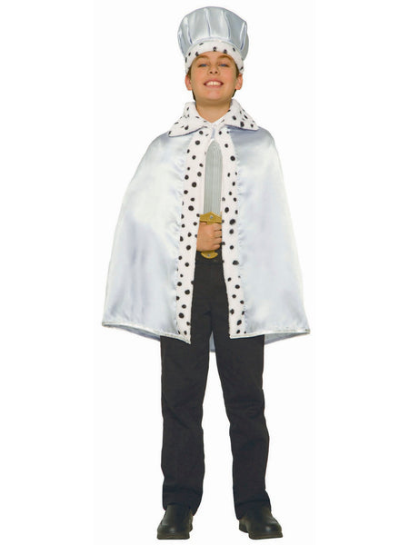 Assume the throne this Halloween! Crown your kids with this King Child Costume Kit! This majestic robe has a white and black ermine trim around the edges along with a fur collar. The large red crown has a single gold stripe down the middle. Get it online today!