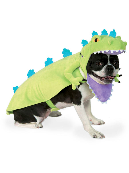 Embrace your 90's Nostalgia with a Rugrats themed pet costume. Buy the Rugrats Reptar Pet Costume and transform your cat or dog into the famous green and blue Tyrannosaurus rex. Featuring a green Reptar hoodie with blue spikes on the back and attached belly straps, a purple open mouth headpiece with teeth, and yellow eyes, you are going to love this precious Rugrats look on your pet this year. For fun, dress up as Tommy Pickles or another Rugrats character to have a Rugrats Halloween!