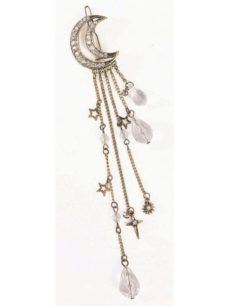 Call upon the power of the moon this Halloween to help pull your costume together in time for your big debut and pick up the Celestial Moon Hairclip Accessory. This product brings with it a small but distinctive flourish that will help pull your hairstyle together while providing a welcome boost to your costumes celestial aesthetic. Featuring the moon, several small chains hang free with star-shaped ends that help give it the visual oomph you want to steal the show.