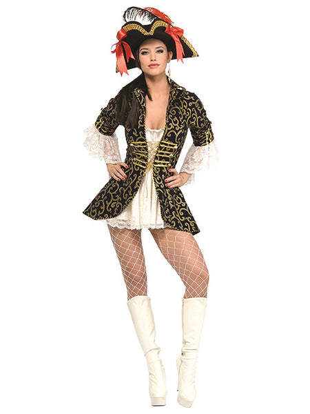 Sail the seas in style with our Women's Sexy Pirate Captain Costume! This all-inclusive ensemble features a dress, jacket, and hat all adorned with intricate black lace detailing. Command attention and embrace your inner pirate queen with this fierce and alluring look.