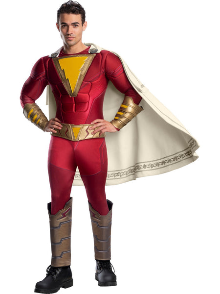 You have been chosen as champion. Put on the Shazam Adult Costume Deluxe and become the alter ego of Billy Batson. The red and yellow bodysuit is a licensed replica of the superheros outfit. Billy was given his powers by a wizard and tasked with using his powers of flight and super strength to combat evil.