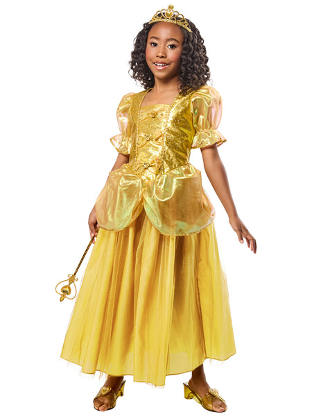 Make every moment feel like a fairytale with this Girls’ Gold Beauty Princess Dress and Tiara set, inspired by Disney’s Beauty and the Beast Belle. Perfect for Halloween costumes or everyday dress-up, this enchanting outfit features a flowing gold tulle dress designed with elegant puff sleeves, shimmering metallic accents, and beautiful gold bow details at the center for a truly royal touch. The included gold tiara, adorned with a heart-shaped gem, completes the princess look and adds just the right amount of sparkle. Comfortable and eye-catching, this Belle-inspired dress is ideal for parties, playtime, and magical adventures. Includes dress and tiara (wand and shoes sold separately).