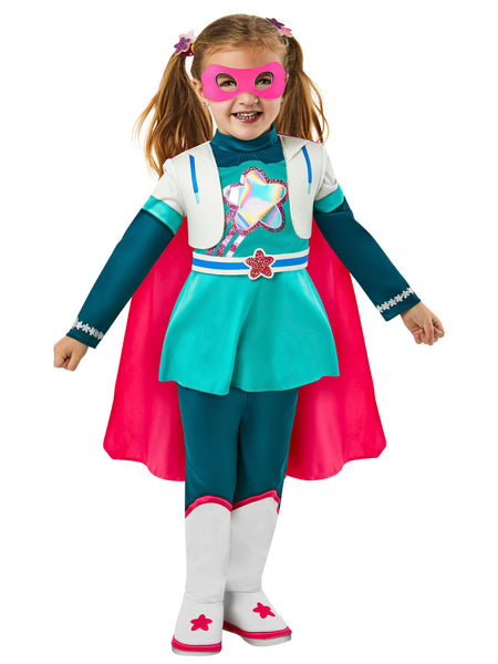Your little one is the only one who can save the world in this Superhero StarBeam Costume for Toddlers! This cute and comfortable combo includes a light blue dress, dark blue pants, attached boot tops, pink cape, pink mask and star hair clips to make them feel like they are just like Zoey from StarBeam. The dress has an attached white vest and features a shiny shooting star. Perfect for imaginative and action-packed playtime or trick-or-treating, you will love watching them run around in this amazing new superhero ensemble!