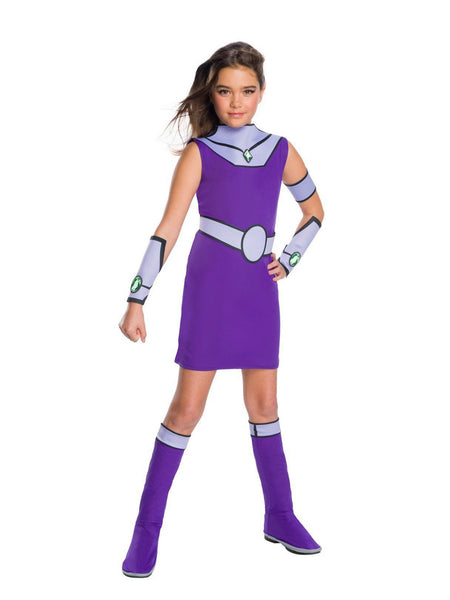 Feel full of the excitement and wear this Teen Titans Go Movie Kids' Deluxe Starfire Costume. Starfire is an alien from Tamaran who comes to Earth and joins up with a group of young crime fighters. She has the ability to fly, has super strength, and can fire laser beams from both her eyes and hands. Starfire is one of the most powerful members of the team and is the target of Robin's affection. Young fans of this hero are sure to have fun playing the role. She wears lots of purple which makes her stand out within the team. You receive all the pieces necessary to bring down enemies in no time! Featuring a bright purple dress with an attached silver belt, matching gauntlets and an arm band, as well as a pair of purple boot tops, she's going to love this extraterrestrial look. Take a look at other Teen Titans and superhero products to include as part of the order. Create your own Teen Titans Go with friends who can become Beast Boy, Cyborg, Raven and Robin so you can all defeat Slade together.