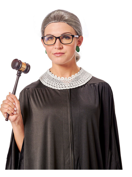 You will bring some major law and order to the party this Halloween when you walk in wearing our RBG Supreme Court Costume Kit for Adult. With your purchase, you will receive everything you need to become a fair and judicious judge. Featuring a gray wig, a pair of green earrings, a pair of glasses, and a white lace collar, you're going to love this professional look this year. Buy your womens judge costume today!