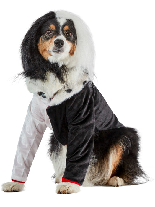 • Your furry friend might be a little confused when she sees she's going to be dressed up as Cruella de Ville! Our 101 Dalmatians: Cruella Pet Costume gives your dog a way to take the villain role and scare all her doggy friends. Watch your pet run around in this black and white pet costume and you might notice that any dalmatians at the dog park are being careful to keep their distance from her!