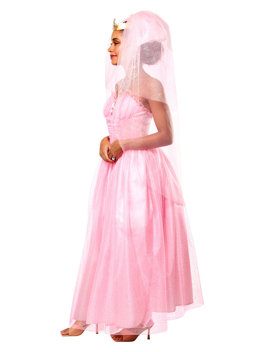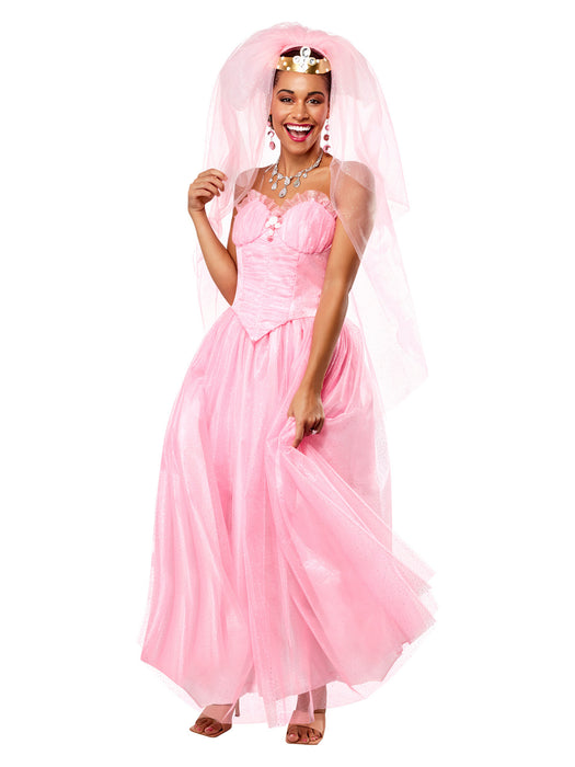 • When Prince Akeem comes to America, he'll certainly have his sights set on you when you're wearing our Adult Coming to America Lisa McDowell Costume. With this set, you will receive everything you need to become the most beautiful bride to ever become Queen of Zamunda. Featuring a gorgeous pale pink dress with a matching pink bride's veil with a golden band, you'll be looking absolutely stunning when you're donning this wondrous attire this year.