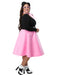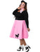 • Well, you can rock it you can roll it, you can stop and you can stroll it at the hop. And you can do it all while wearing the Adult plus Pink Poodle Skirt Costume. This knee-length skirt can be ordered in 1X or 2X sizes. Showcased on front is a black poodle applique with 3-D pink collar bow and shiny silver leash that runs from the waist to the poodle. A poodle skirt it basically a circle skirt - that is a circular piece of fabric with a hole cut in the middle for the waist - accented with a decorative applique. Many designs were placed on the skirt, including holiday themed appliques, but the most popular was, and still is, the poodle. Shirt and scarf do not come with the costume, but we have 50's-themed tops and scarves available to order.