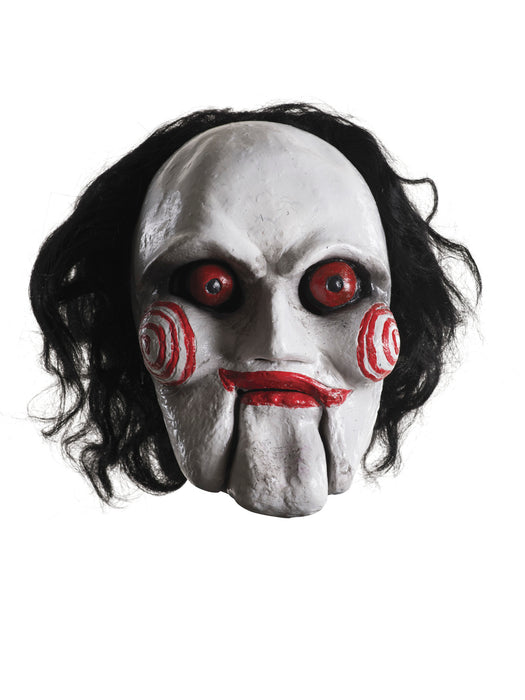 • Everyone knows Jigsaw's not so delightful partner. Billy, the iconic puppet from the Saw series, is a creepy costume perfect for Halloween. The Saw Adult Billy Mask will complete your look. This full mask is made from lasting latex, which allows vibrant colors and details to come out in the molding. The Billy mask comes with the classic ventriloquist mouth, pasty white skin, and red spirals on cheeks. Don't forget the greasy black hair that is sure to make anyone's skin crawl. from the Saw franchise, perfect for Halloween. Order your Billy Saw mask online!
