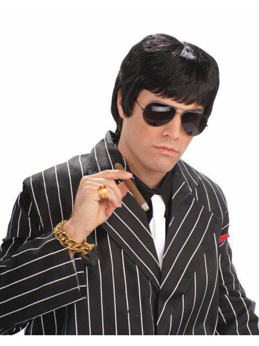 • No one will mess with you when you look this tough. The Adult Tony Wise Guy Wig is the perfect accessory for your mob boss costume. The black wig pairs well with a black pinstripe suit, fake cigar, and flashy jewelry. You will be a made man at any costumed party.