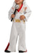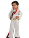 Aren't you the littlest hunk of burning' love! Wear an Infant Toddler Elvis Romper Costume and sing the night away. Each fullbody jumpsuit is cut from soft white fleece. The bell sleeves and pant legs will make you look good on the front page of Rolling Stones. A faux red undershirt is sewn into the V-cut top, matching the panels in the long pants. Red, blue, and gold dots outline wings on the chest and American eagles on the belt so you can show off your American spirit. Look nice and professional with the standing collar and the press won't be able to get enough of you! The suit closes at the back and is large enough to wear thin layers beneath. When the whole world knows your name, you have to live up to it. Suit up in your Infant Toddler Elvis Romper Costume and impress your fans! Have your mom and dad dress up in their own Elvis costumes (sold here) and turn it into a family business.
