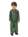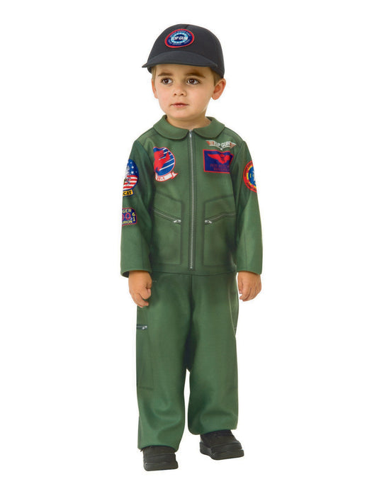 • Little ones with the need for speed should be wearing the Toddler Top Gun Romper. Instead of hopping into a fighter jet though, they will be running around the house playing the part of a super cool pilot. Parents who are fans of the Top Gun film will love having their child play the role of some of its characters. It was a huge hit in the 80?s and still quite popular today. This particular item comes as a single piece jumpsuit. It is modeled after the green uniforms that pilots wear. There are zipper, pocket, and patches designs printed along the surface. Orders also come with a hat depicting the title in a logo. Not only can this Top Gun costume be worn to represent characters, it is great as a form of play for becoming a jet pilot in general. Let your child?s imagination soar all the way to the sky!