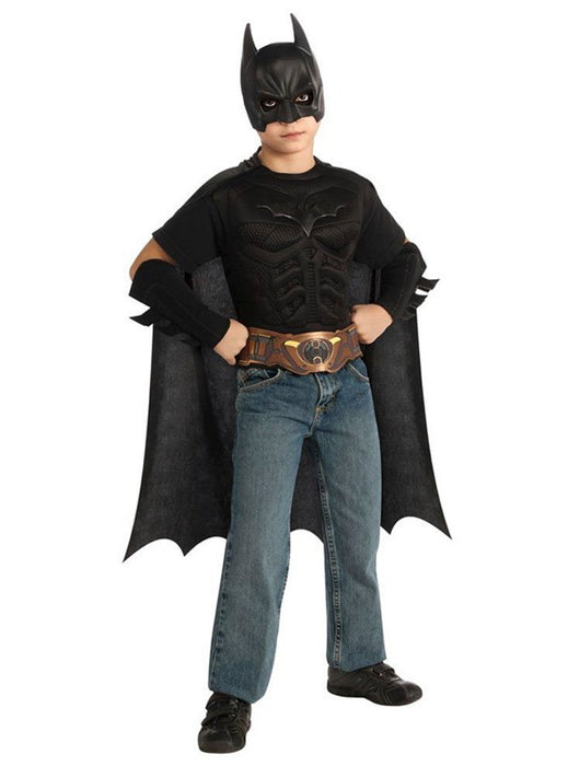 • Tell the story from the start in this Batman Begins Kid's Costume Kit. Young fans of the superhero will be able to put their own twist on the Christian Bale version of the character. This ensemble comes as a black shirt top with built-in padding and armor. A pair of spiked gauntlets and cape are included. A brass style utility belt gives a bit of color. Complete the look using the iconic mask to hide your identity. Attend themed events in this and you can take down Ra's al Ghul, Scarecrow, Joker and more!