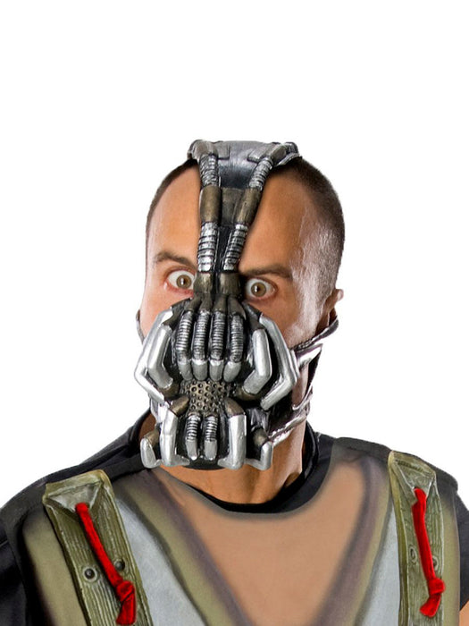 • Bane needs his signature face mask, so don't forget to accessorize your costume with the Batman Dark Knight Bane Adult Mask! The mask, which is designed to look just like the one from the movie, is silver and covers your nose and mouth with a strap going over and around your head.