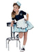 • You have the burger, the fries, the cream soda...oh no! What about the milkshake? Be the cutest waitress anyone has seen when you put on this Car Hop Girl Child Costume! The black dress has short sleeves and a patch that reads, Junior's Diner. The white lapels and cuffs match your bright white apron, the black ruffle running along the edge adding a cute flair. The A-line skirt is sewn from blue satin that will shine as you're skating out to talk with your customers. A small blue cap comes with the set, its string of sequins matching that on the cuffs and apron. Pop it on to finish your Car Hop Girl Child Costume and you're sure to have a great shift! Wear it with black shoes, bobby socks, and 50s jewelry (sold here) to look like you stepped out of America's past.