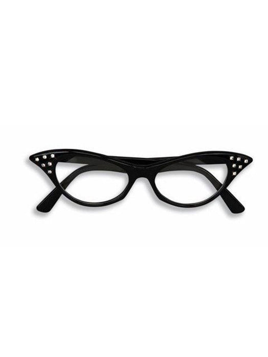 • The Black 50s Glasses are the perfect supplement to your 50s inspired costume this Halloween! The black glasses are pointed at the top of the eyes and are garnished with silver studs. The frames do not contain any lenses.