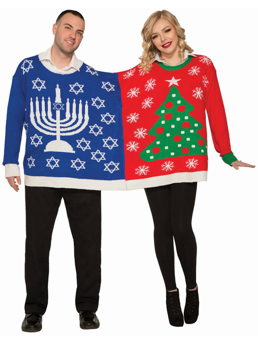 • You don't have to separate the winter holidays anymore. Just celebrate both when you pick up our Chanukah/Christmas for Two Sweater! With your purchase, you will receive a lovely conjoined sweater fit for two. One side features a magical red and green aesthetic with a Christmas tree and snowflakes, and the other features a beautiful blue with white Jewish stars and a menorah. Buy yours today, and go celebrate the holidays together in style!