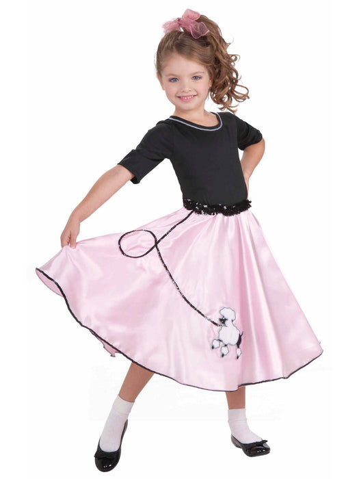 • As soon as she steps into this Child Pretty Poodle Princess Costume, your girl is going to be ready to rock around the clock! This nifty fifties outfit would feel right at home on American Bandstand and it includes a top and a skirt with a black sequin belt attached at the waistband. The sleek black shirt has three quarter length sleeves and dainty white trim on the round neckline. The cotton candy pink satin swing skirt features a sweet little poodle applique with a black sequin leash. Poodle skirts were incredible popular in the 1950s not only because they were cute and stylish, but they were easy to make at home. Most girls wore them casually and dressed them up for sock hops with bobby socks, hair bows, and pearl jewelry. These great accessories are all available separately to complement this Child Pretty Poodle Princess Costume!