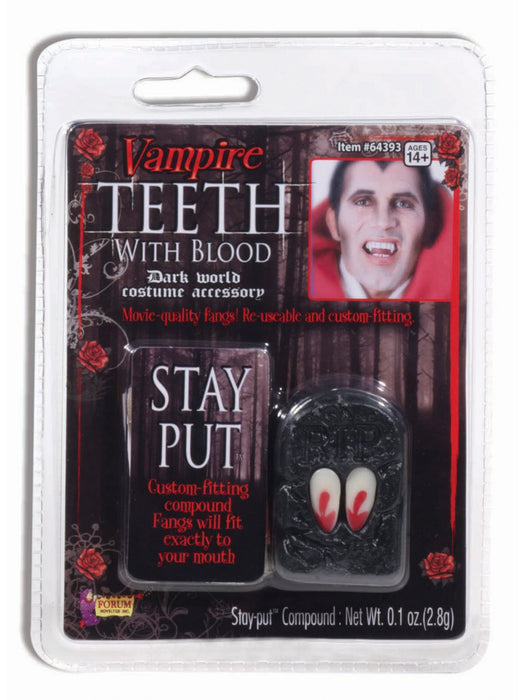 • When you take a bite out of your next victim, you can do it with some cinematic realism when you use these Classic Vampire Fangs With Blood! Use these fangs to claim your place as one of the most formidable vampires in culture, right up there with Dracula and Nosferatu. The blood that comes from these fangs will make it look like youre really sucking blood out of your friends on Halloween, so people are going to be buttoning up their collars when youre around!