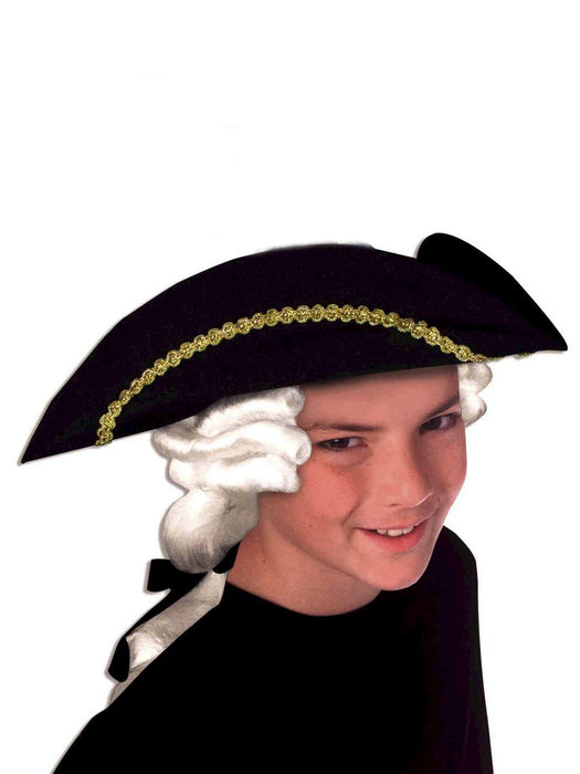 • Be one of America's Founding Fathers with our Child's Colonial Hat with Wig. This 18th century style hat is a tricorn hat with a gold trim and feather accent. You can dress up like so many important historical figures from the Colonial and Revolutionary era with this great costume headpiece. The colonial hat also comes with a time period appropriate wig. The powder white wig features a typical colonial style. Dress up for holidays, parades, school productions, and parties with our Child's Colonial Hat with Wig.