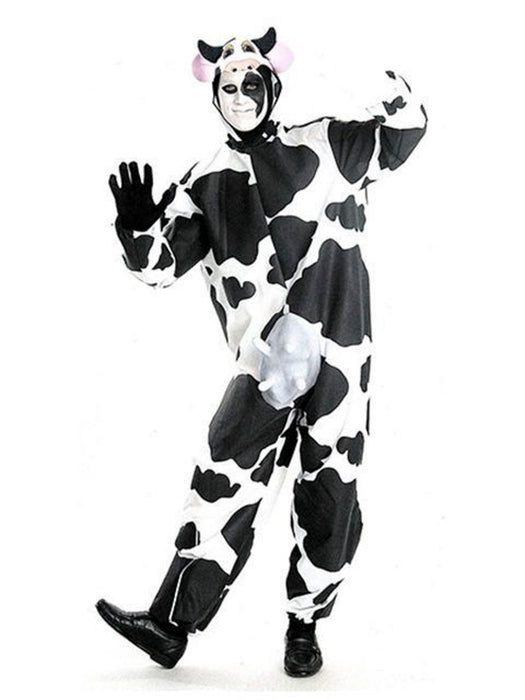 • Moo-ve over, we have got an amusing Halloween outfit for you. The Comical Cow Adult Costume includes a white and black spotted jumpsuit, headpiece and udder. The 3-D headpiece features a cow face, horns and ears. You can order black and white makeup from us if you want an udderly complete cow look. According to estimates, there are presently about 1.3 billion cows in the world. First domesticated about 10,500 years ago, these animals have been used for meat and milk. Cow manure is used for fertilizer and fuel. Cow leather is used today mostly used for clothes and furniture coverings, but in the past it was used for shelter, jewelry, containers for liquid and books. This humorous garb will make you the life of the party.