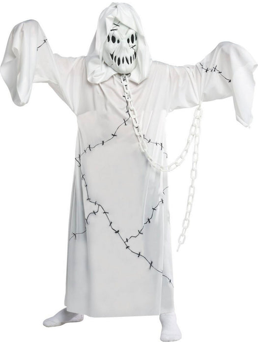 • Give your child a truly haunting Halloween this year when you pick up our Cool Ghoul Kids Costume! With your purchase, you will receive a spooky white robe with black stitch print and an attached white chain, as well as a white skull mask. Pair this with a fun scythe or sword from our site, and your child will really be terrorizing the town. Buy your costume today, and go make this Halloween a real terrifying night to remember!